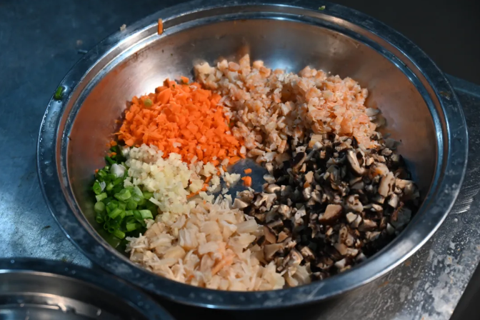 ▲将配料与糯米饭翻炒均匀