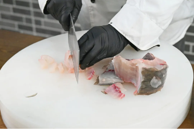 在制作鱼子饼的过程中,朱辉坚持选用新鲜的白鱼、青鱼等作为原料,通过精细的刀工将鱼肉刮下,去除鱼刺后斩化成肉泥。