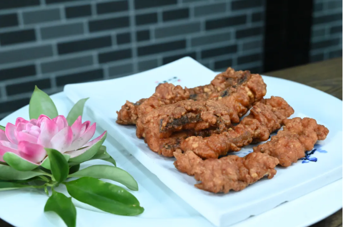 “‘两炸一浇’是制作的‘小窍门’。初炸定型,复炸使其酥脆,最后淋上冷油,让外皮更脆,颜色更红亮,宛如琥珀。”林钦俊说着,将炸好的鳗鱼装盘,只见鳗鱼外皮红亮似霞,内里雪白如玉,入口酥脆与鲜嫩交织,酒香与海味共舞,让人回味无穷。