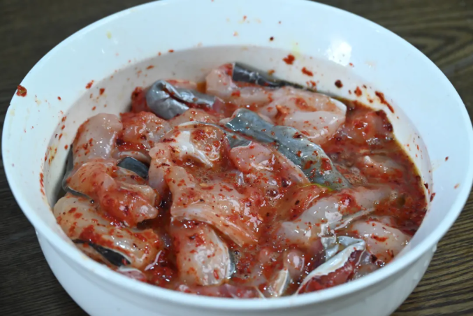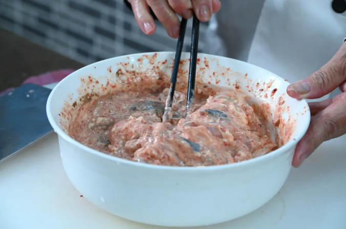 ▲把姜末与红糟剁泥,加多种调料拌匀后腌鱼