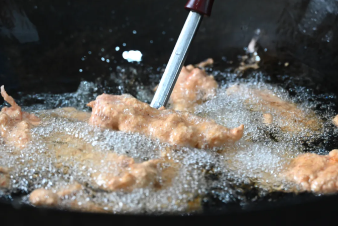 ▲将鱼段放入六成热油中火炸4分钟至酒糟红捞起