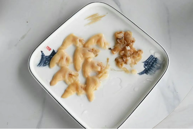 吊汤环节更见真功夫。老母鸡、猪瘦肉、牛肉经文火慢煨一整天,再通过反复过滤去浊,方能熬出清可见底的高汤。最考验功力的便是“汆”的火候:滚烫鸡汤冲入碗中,薄如蝉翼的蚌片瞬息由透明转为乳白,不过数秒便蜷成月牙状。趁热入口,汤是温润的鲜,蚌是脆嫩的甜,没有重油重盐的霸道,只有含蓄绵长的清润,仿佛将大海的滋味尽数纳入一碗。