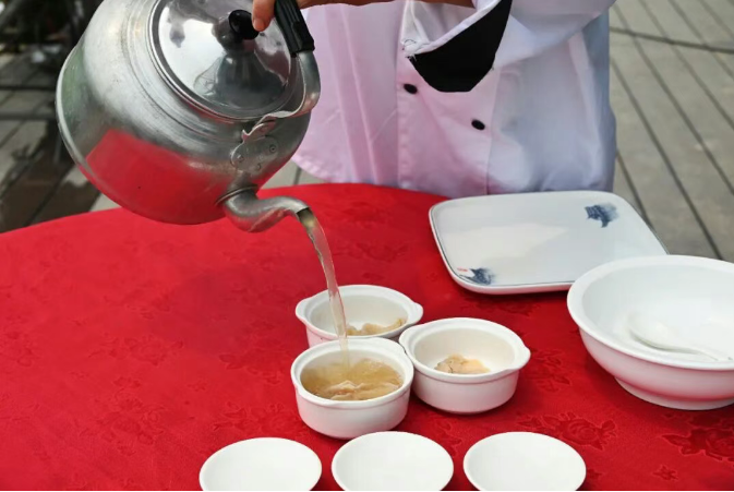 ▲滚烫高汤冲入碗中,将海蚌片烫熟