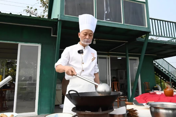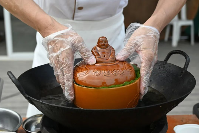 做展示的福建闽菜大师林世伟表示,佛跳墙的考究从食材处理便已尽显:鱼翅、鲍鱼、海参需提前悉心预处理,猪肚切条、鸭胗刻花、木鱼切片……每一种食材都匹配专属刀工与火候。高汤熬制耗时五小时,金黄清润的汤头淋入炒香的食材,再以荷叶密封酒坛,文火慢煨五十分钟。开坛瞬间,酒香与鲜香交织扑鼻,鲍鱼弹牙、海参软糯、香菇醇厚,多重滋味在舌尖交融,堪称一场极致的味觉盛宴。