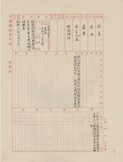 在目前已有史料中,吴石早年在京汉铁路管理局工作的经历未见提及,该履历表可以填补有关空白。