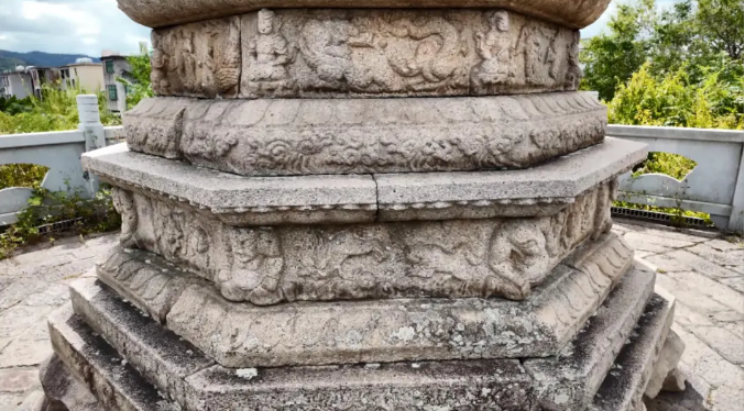 据宋代梁克家所撰《三山志》记载:“塔林寺在方山下,太建年置。” 这座古塔始建于南朝陈太建年间,距今已有1400多年历史。仔细观察塔基,可见圭脚处刻有倒莲瓣纹样,上方覆盖着塔裙;塔裙之上是两级八面石座,雕刻着精美的飞天图案;石座上方为倒莲座,其八角处刻有粗壮的立式顶托像,像与像之间还刻有 “双龙抢珠”“双狮戏球”“丹凤朝阳” 等精美图案。刚柔并济的雕刻,尽显中国古代工匠的高超技艺。