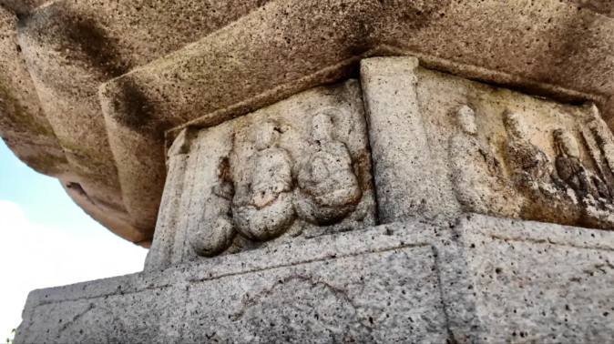 “庵塔是尚干的地标性建筑,共有7层,每层都有8个角,由实心条石砌筑而成。它整体分为三部分:底座、塔身与塔刹,塔刹中曾嵌有一颗宝珠。塔座两层,八角有力士托莲花座,刻有祥云与飞天图案。” 闽侯百六峰诗社社长林金宝介绍道。