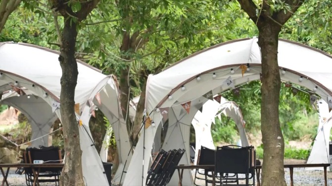 茂盛树木间,错落有致地搭建着宽敞的帐篷。沐山涧营地大部分保留着场地内原生态景观,在山野间为游客打造出能享受片刻清闲的“乌托邦”。每隔一段时间,这儿还会更新一些项目,或是提供个性化食材定制等。