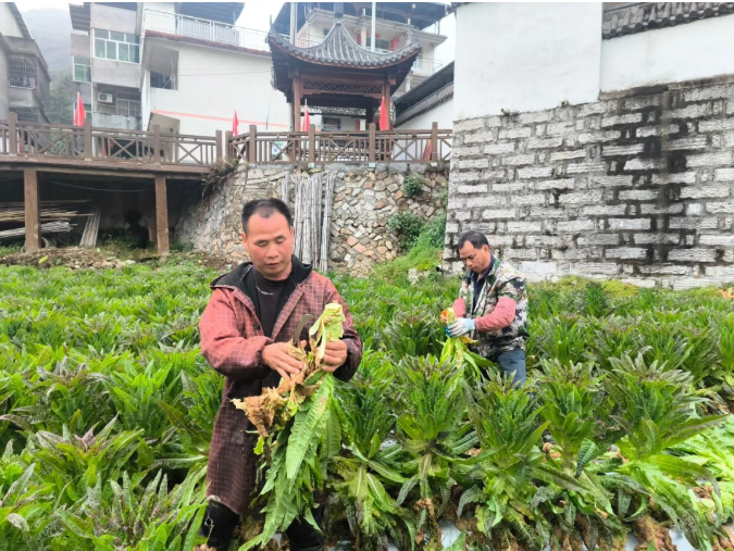 ▲农户阮贤秀和家人在采摘莴笋