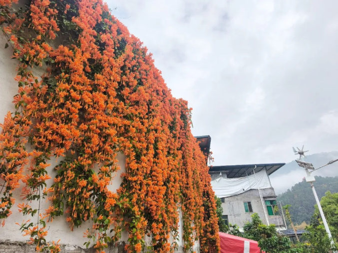 ▲村民家门口绽放的“炮仗花”