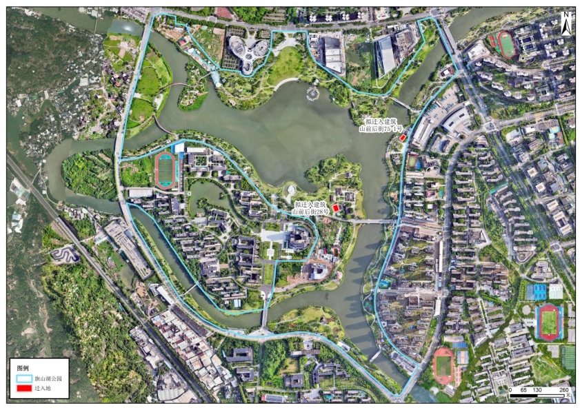 因项目建设需要,现拟将山前后街28号、山前后街75-1号建筑从原址迁出并入新址上街镇旗山湖公园。拟迁建的旗山湖公园作为大学城中心共享区的重要节点,融合高校人文氛围与自然景观,是兼具生态、景观与防洪功能的城市绿色空间。山前后街28号、山前后街75-1号建筑迁入该地,用地和建筑功能符合迁入地块的用地性质,且能强化迁入地文化内核,有利于老建筑的集中保护,有利于今后的科学合理再利用。