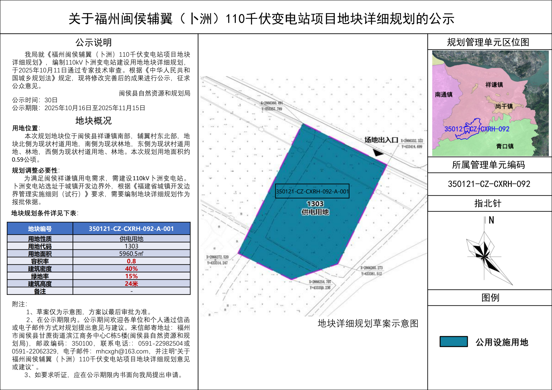 我县委托福州市规划设计研究院集团有限公司编制的《福州闽侯辅翼(卜洲)110千伏变电站项目地块详细规划》于2025年10月11日通过专家技术审查。根据《中华人民共和国城乡规划法》中“第二十六条 城乡规划报送审批前,组织编制机关应当依法将城乡规划草案予以公告,并采取论证会、听证会或者其他方式征求专家和公众的意见。公告的时间不得少于三十日。”的要求,现将修改完善后的规划草案公示征求公众意见。