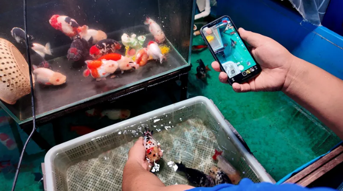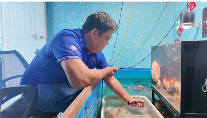▲郭辉查看金鱼生长状况