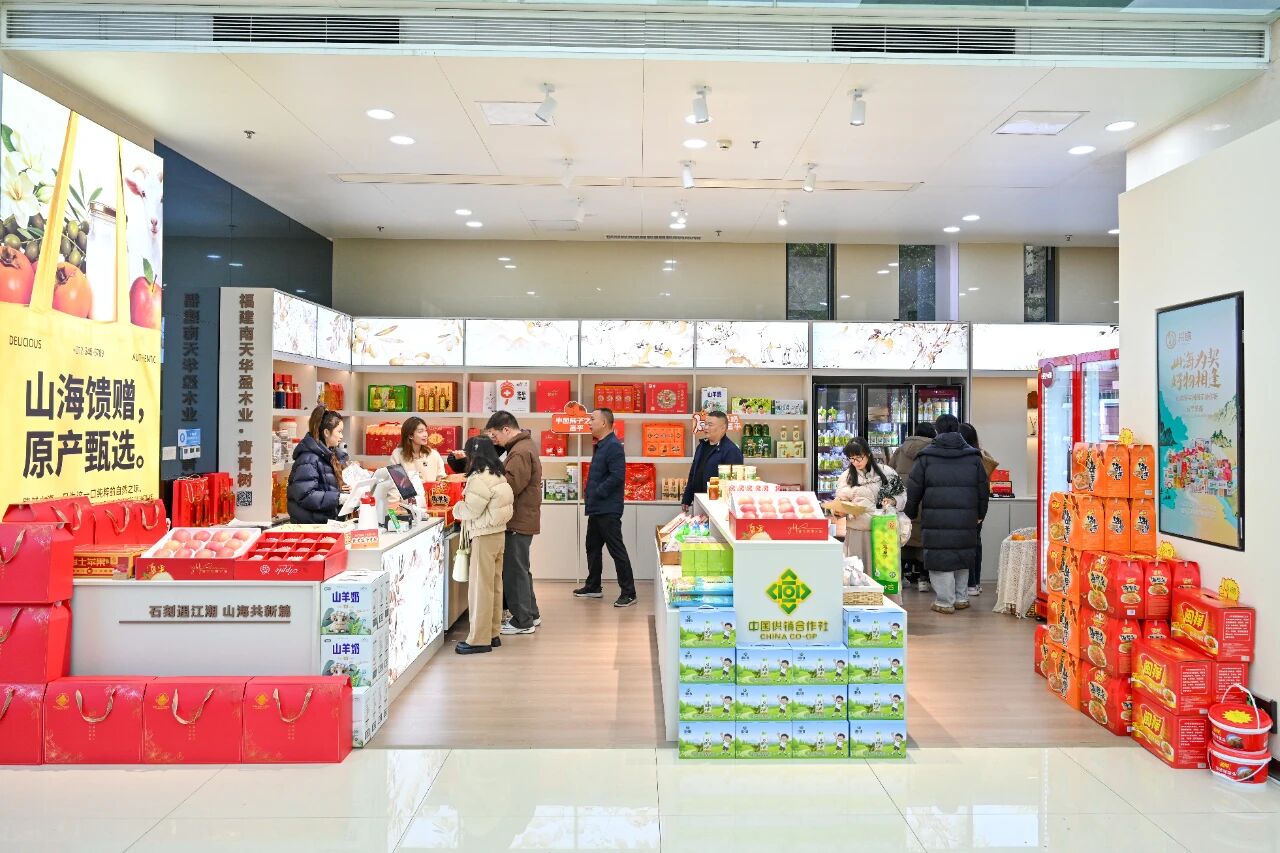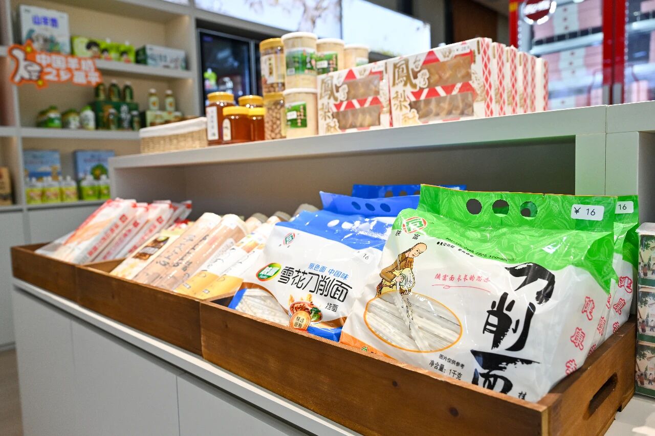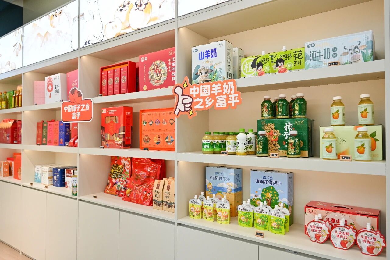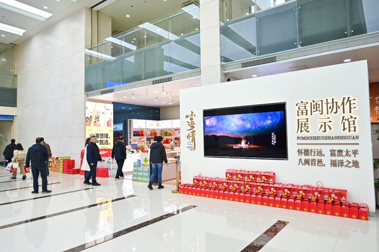 今日,记者走进这座面积约80平方米的展示馆,浓郁的地域风情与协作气息扑面而来。货架上,富平柿饼的绵密香甜与闽侯橄榄的清冽回甘相互交织,富平苹果、羊奶粉、琼锅糖,以及闽侯线面、尚干拌面扁肉、沃柑等特色产品陈列、错落有致,勾勒出跨越千里的风味图谱。