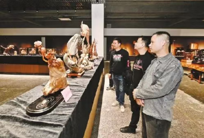 ▲游客在福州木根雕产业创意园欣赏木根雕作品?郑帅/摄