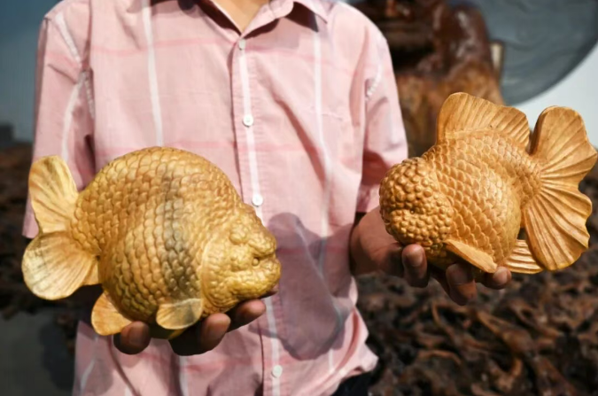 在张其仕的工作室,记者看到一组栩栩如生的金鱼作品。“金鱼是闽侯的特色产业,这组金鱼木雕是我们和首邑产投集团合作的文创产品,作为伴手礼在市场上广受欢迎。”张其仕说,木根雕也在根据市场需求与时俱进。“很多手艺人的技艺并不过时,而是需要一个平台,让手艺人创造出有时代感的作品。”张其仕说。