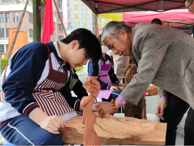 ▲带领高校学生体验木雕的制作过程?张其仕供图