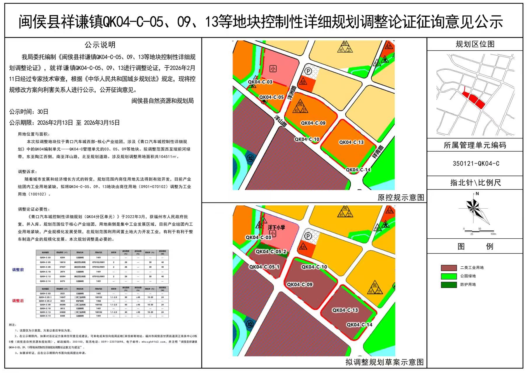 闽侯青口汽车工业园区管理委员会委托福州市规划设计研究院集团有限公司编制的《闽侯县祥谦镇QK04-C-05、09、13等地块控制性详细规划调整论证》于2026年2月11日通过专家技术审查。根据《中华人民共和国城乡规划法》中“第二十六条 城乡规划报送审批前,组织编制机关应当依法将城乡规划草案予以公告,并采取论证会、听证会或者其他方式征求专家和公众的意见。公告的时间不得少于三十日。”的要求,现将修改完善后的规划草案公示征求公众意见。