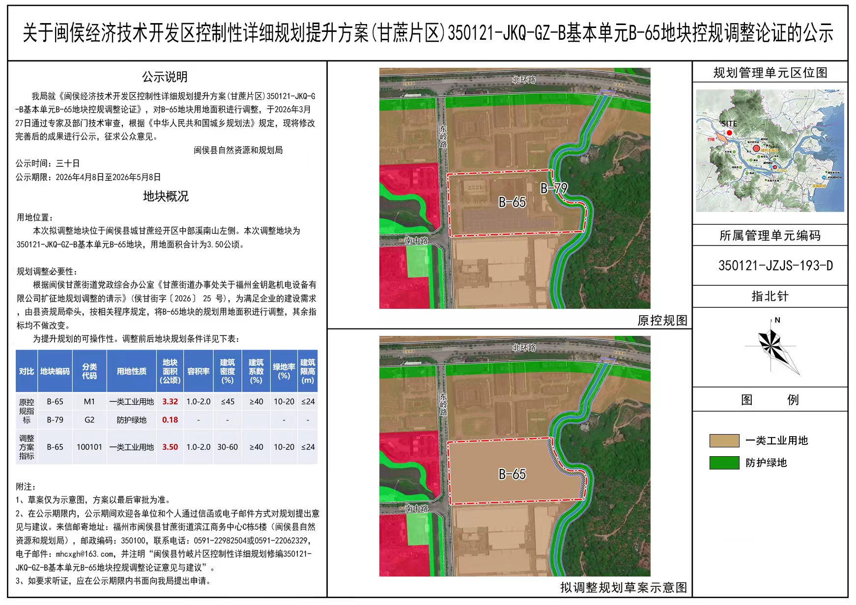我县委托福建省城乡规划设计研究院编制的《闽侯经济技术开发区控制性详细规划提升方案(甘蔗片区)350121-JKQ-GZ-B基本单元B-65地块控规调整论证》于2026年3月27日通过专家技术审查。根据《中华人民共和国城乡规划法》中“第二十六条 城乡规划报送审批前,组织编制机关应当依法将城乡规划草案予以公告,并采取论证会、听证会或者其他方式征求专家和公众的意见。公告的时间不得少于三十日。”的要求,现将修改完善后的规划草案公示征求公众意见。