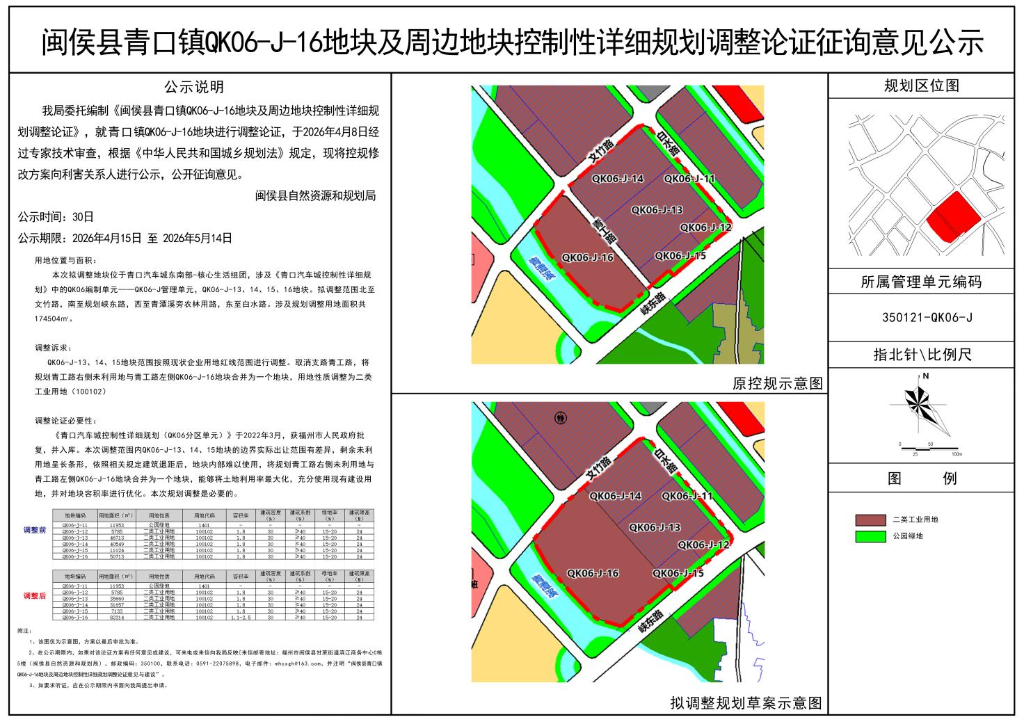 我县委托福州市规划设计研究院集团有限公司编制的《闽侯县青口镇QK06-J-16地块及周边地块控制性详细规划调整论证》于2026年4月8日通过专家技术审查。根据《中华人民共和国城乡规划法》中“第二十六条城乡规划报送审批前,组织编制机关应当依法将城乡规划草案予以公告,并采取论证会、听证会或者其他方式征求专家和公众的意见。公告的时间不得少于三十日。”的要求,现将修改完善后的规划草案公示征求公众意见。