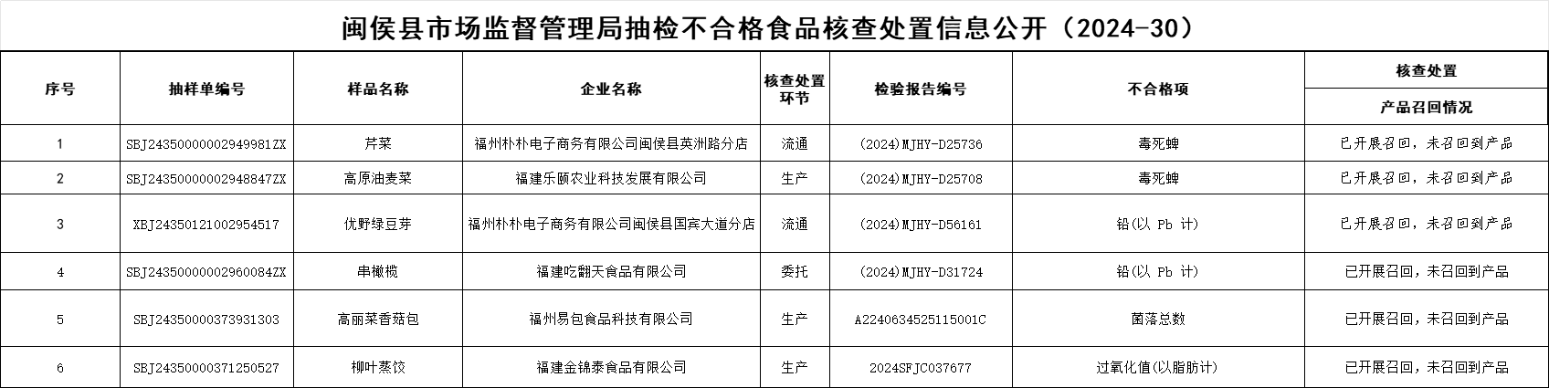 闽侯县市场监督管理局抽检不合格食品核查处置信息公开(2024-30)