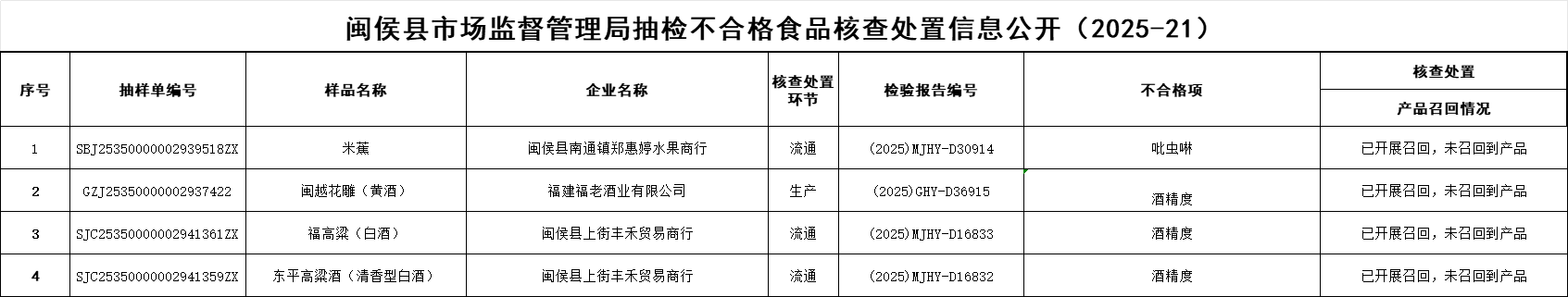 闽侯县市场监督管理局抽检不合格食品核查处置信息公开(2025-21)