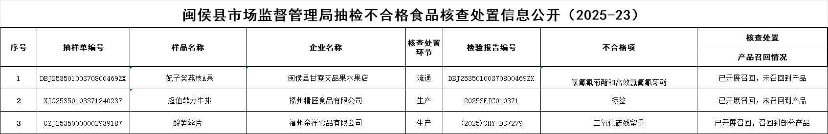 闽侯县市场监督管理局抽检不合格食品核查处置信息公开(2025-23)