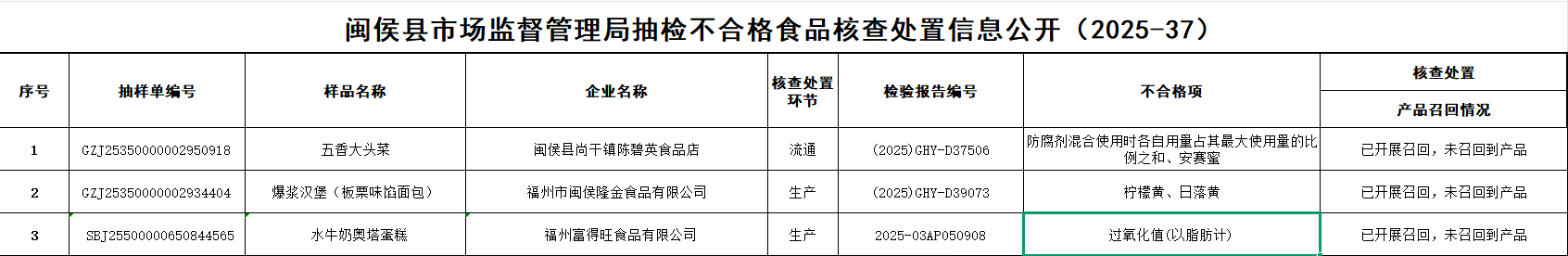 闽侯县市场监督管理局抽检不合格食品核查处置信息公开(2025-37)