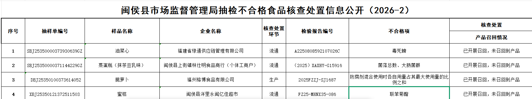 闽侯县市场监督管理局抽检不合格食品核查处置信息公开(2026-2)
