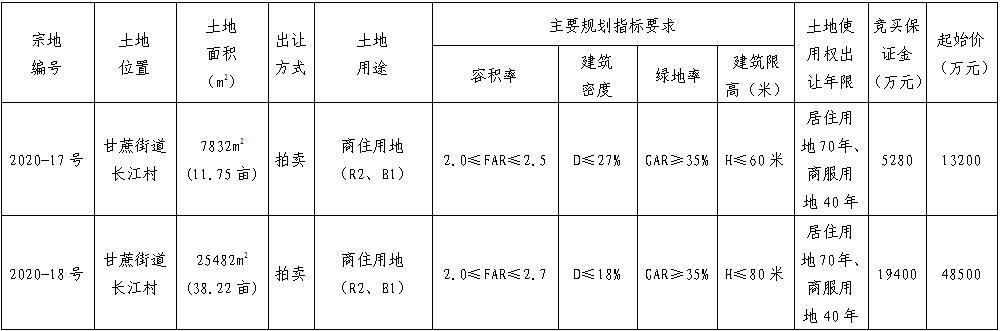 3、拍卖竞价方式:本次拍卖竞价采用“限房价、控地价、公开摇号”方式:即地块设定最高限制价格宗地最高限价(宗地2020-17号最高限价18400万元、宗地2020-18号最高限价67200万元),竞买人报价低于最高限价的,按价高者得原则确定竞得人;当报价达到最高限价后,不再接受更高报价,且有其他竞买人愿意接受该最高限制地价,则竞买方式转为采取公开摇号方式确定受让人。凡接受最高限制地价的竞买人均可申请继续参与摇号,并将最终摇中者确定为受让人。